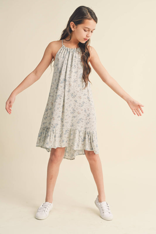 heart and arrow - TWEEN KIDS GIRLS HALTER FLOUNCE DRESS: Sage/stone blue