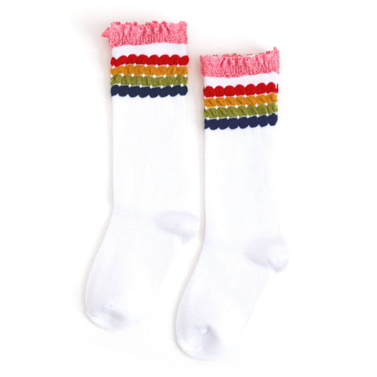 Little Stocking Co. - Rainbow Bubble Stripe Lace Top Knee High Socks