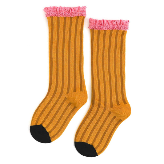 Little Stocking Co. - Marigold Striped Lace Top Knee High Socks