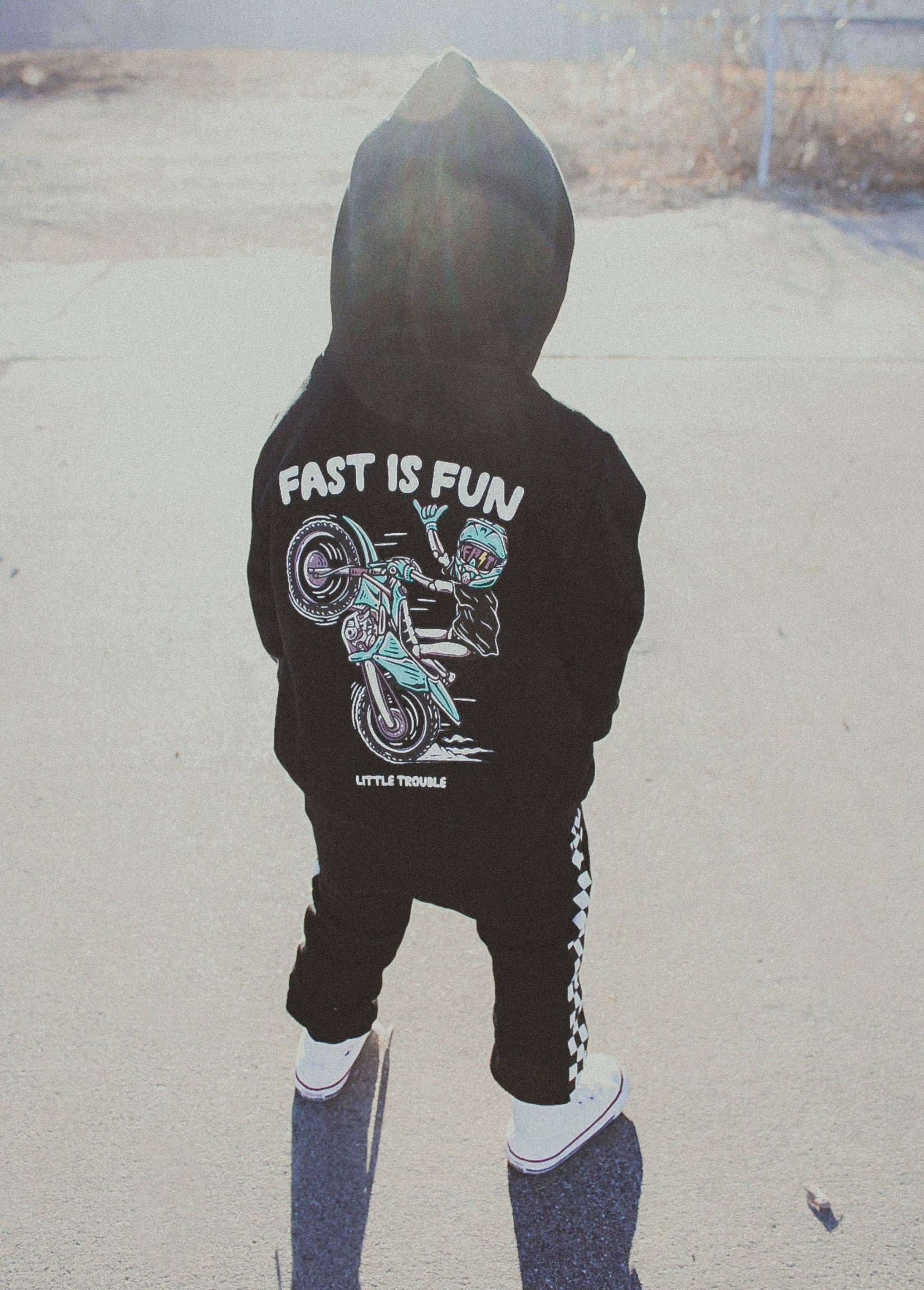 For the ones who live with their feet off the ground and a grin under the helmet — FAST IS FUN is the hoodie that shaped the Little Trouble vibe.